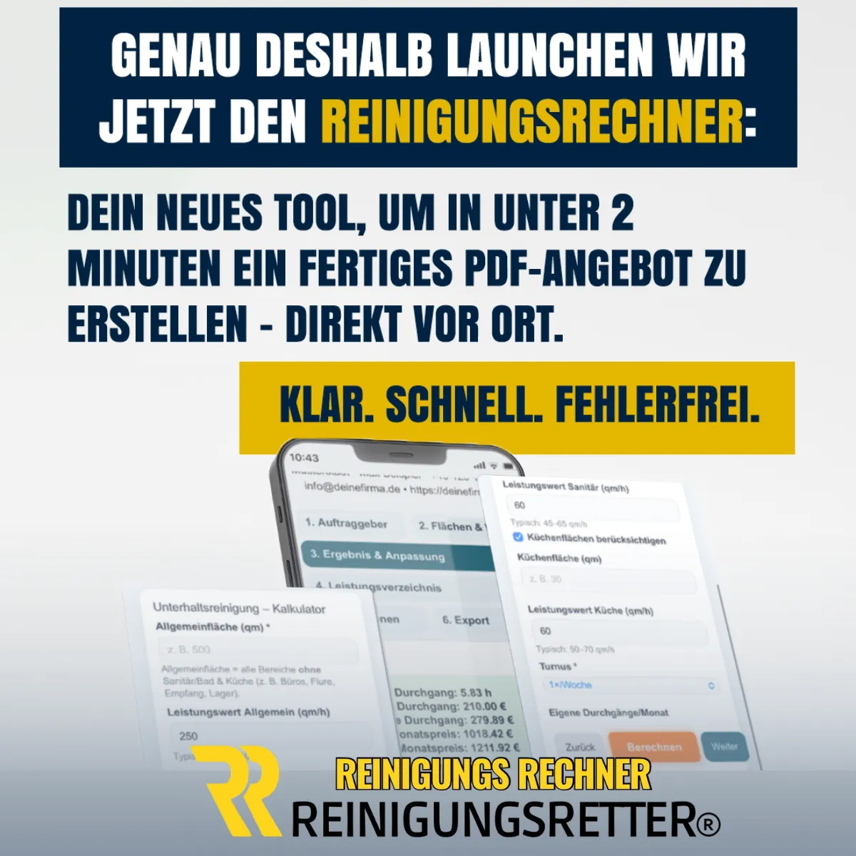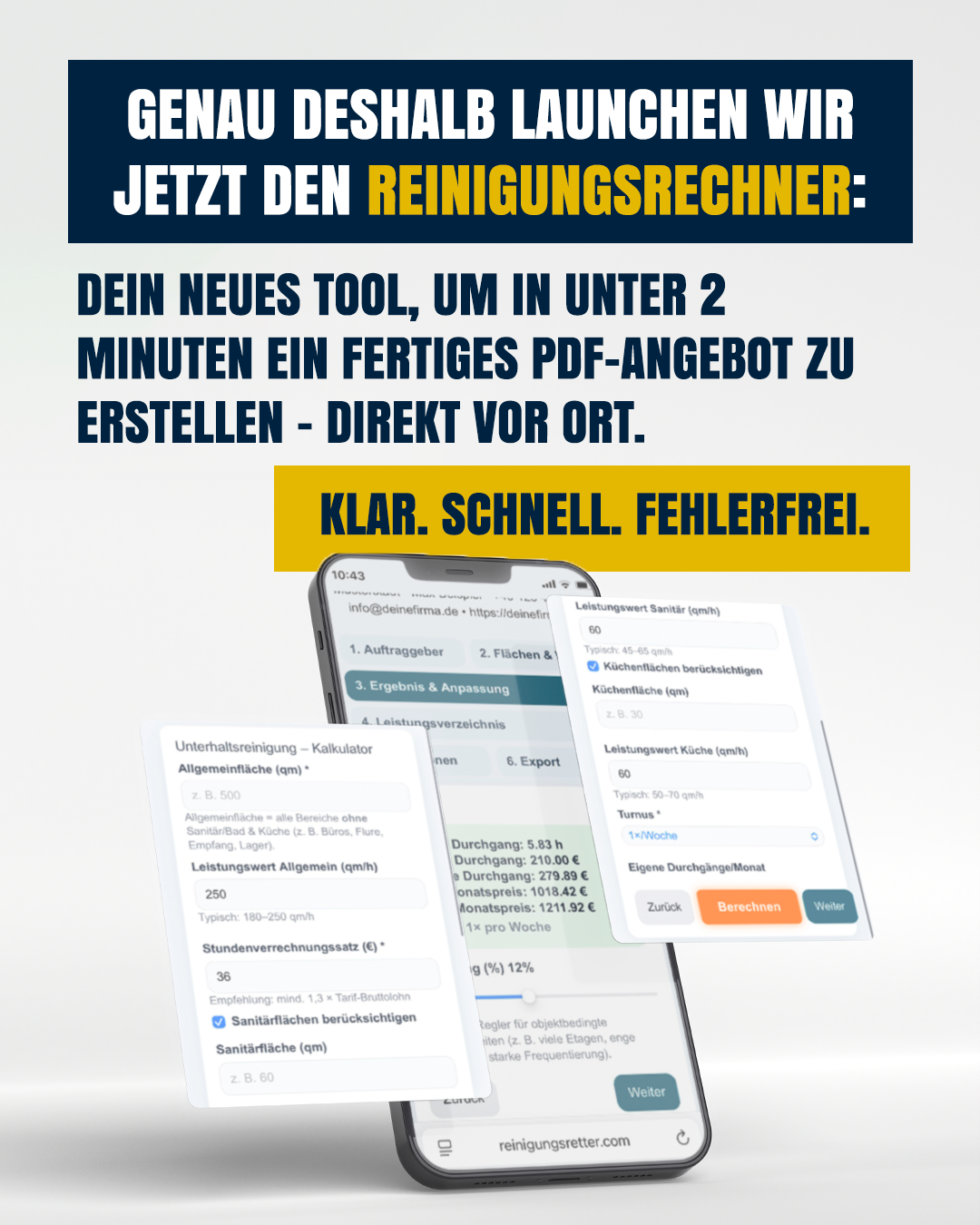 Der Reinigungsrechner ist zum Start nur als Einführungsangebot verfügbar – exklusiv für unsere Follower, Community-Mitglieder und die echten Macher der Gebäudereinigung.
