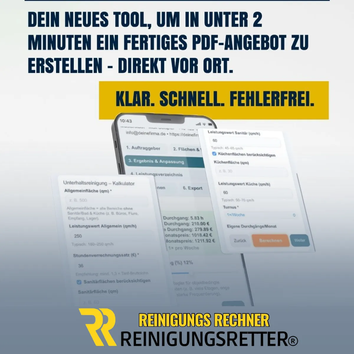 Kein stundenlanges Erstellen mehr, kein Rätselraten. Mit dem Reinigungsrechner kalkulierst du blitzschnell, verschickst sofort ein sauberes PDF sammt Leistungsverzeichnis – und sicherst dir den Zuschlag, bevor der Kunde abspringt.