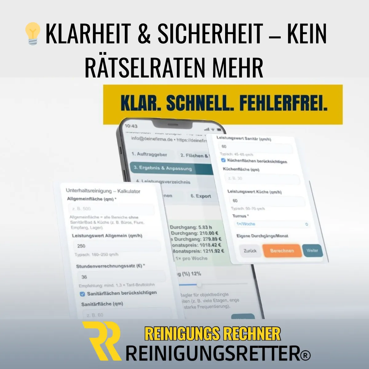 Der Reinigungsrechner zeigt dir den echten Wert deiner Leistung – und sorgt dafür, dass du fair, aber profitabel anbietest.