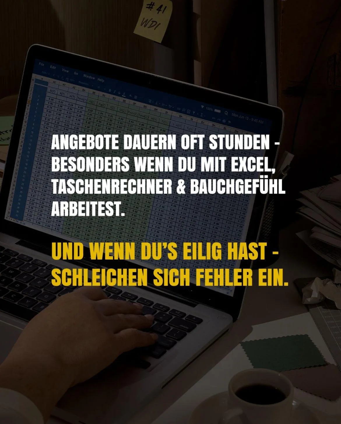 👉 Du stellst die Parameter einmal ein, dein Mitarbeiter tippt nur noch Quadratmeter & Eckdaten ein – fertig.